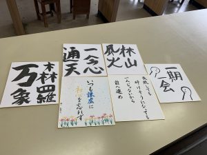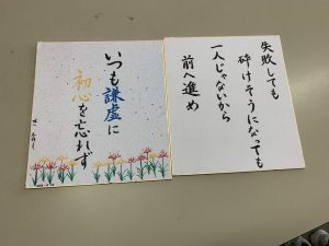 例えば、3×4メートルの大きな作品を入学式などの行事や依頼があったお祭りなどに向けて作りました。小さな作品だと色紙に自分の座右の銘を書きました。また、鮮やかなカラー書道にも挑戦しており、見ていて晴れやかな気持ちになれる作品を目指して頑張っています。